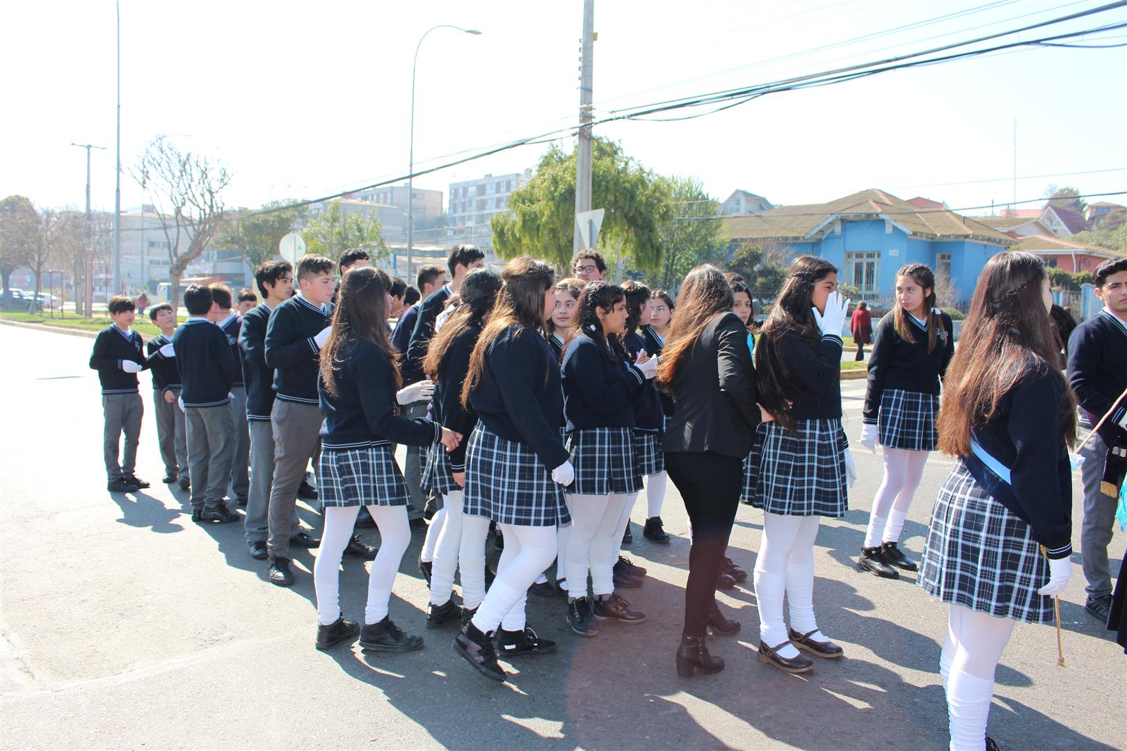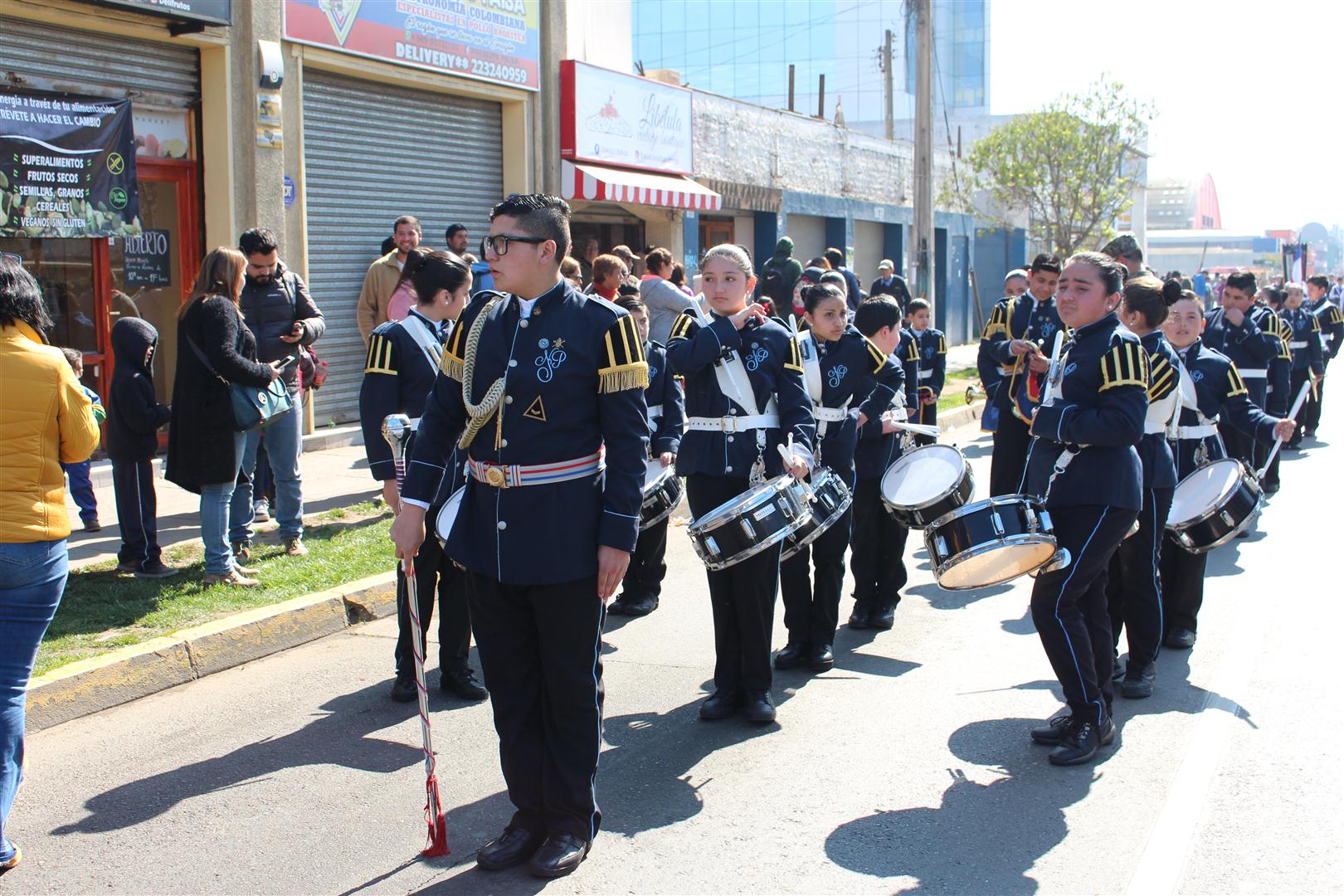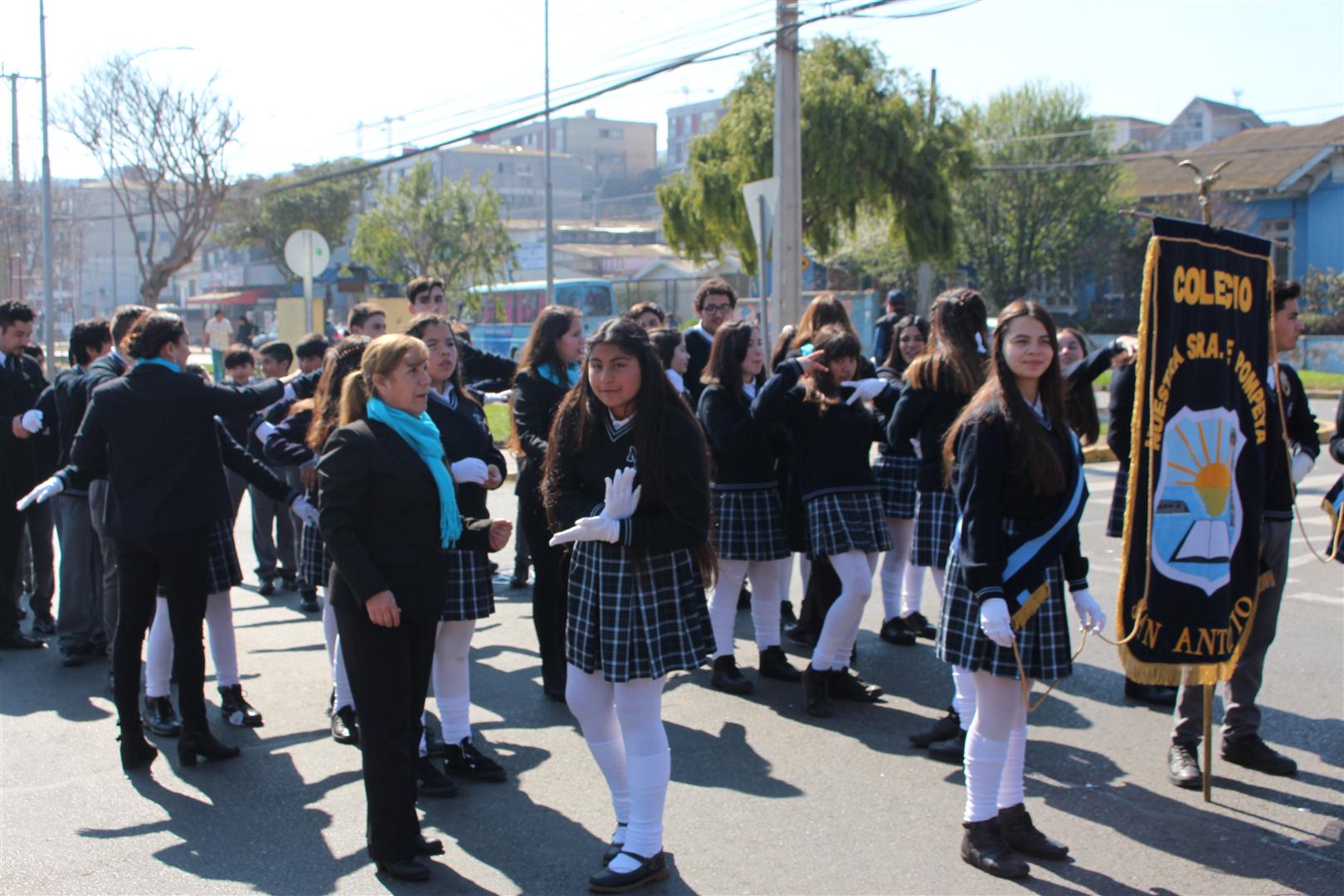 Presentación de los alumnos del establecimiento junto a la Banda de guerra del Colegio Nuestra Señora de Pompeya, en desfile alusivo al natalicio de Bernardo O`Higgins.